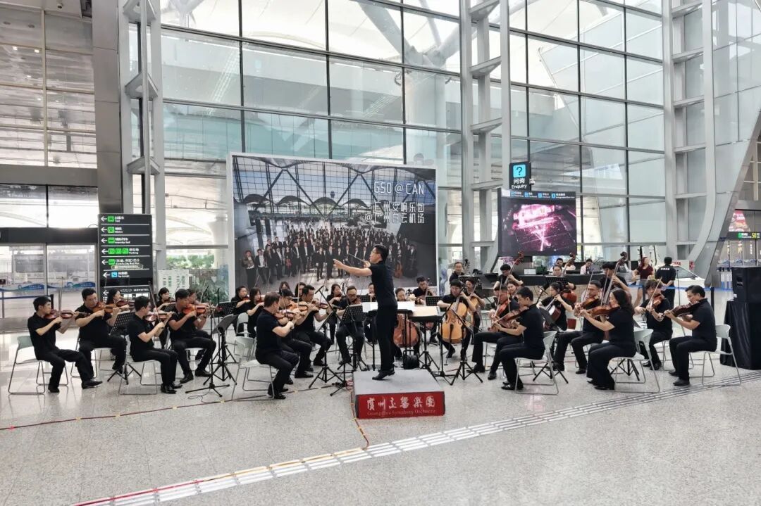 2025年7月29日,广交携手青年指挥孙一凡,在T2航站楼“广交×白云机场”巨幅海报下,奏响了一系列融汇中西的经典乐曲